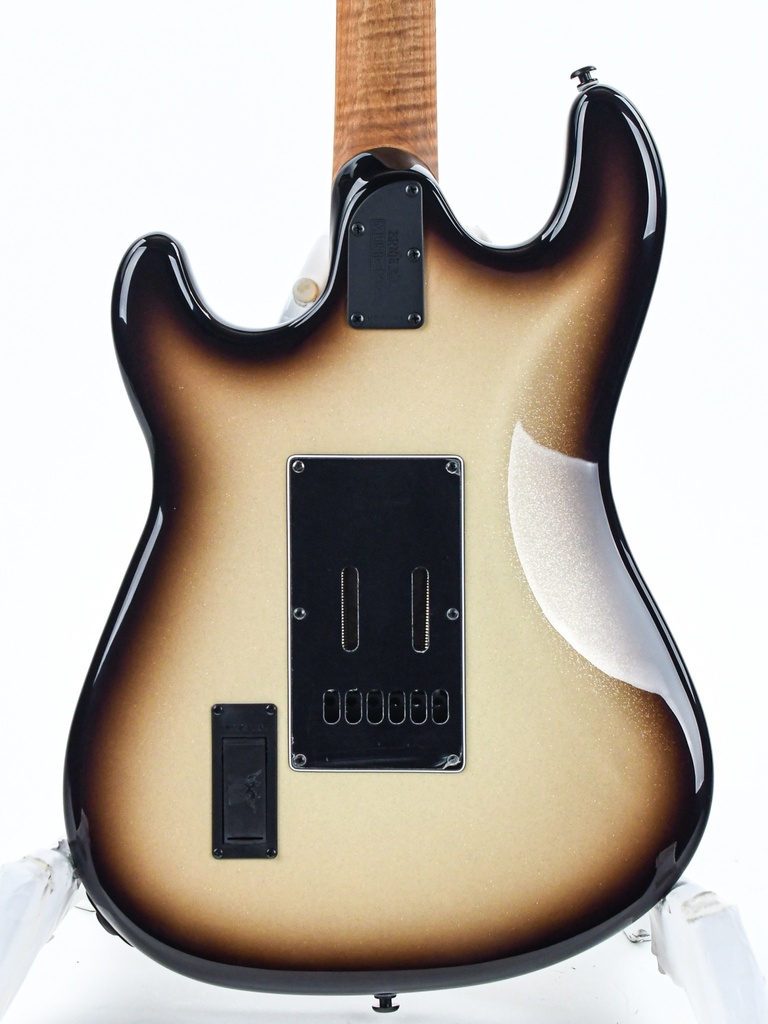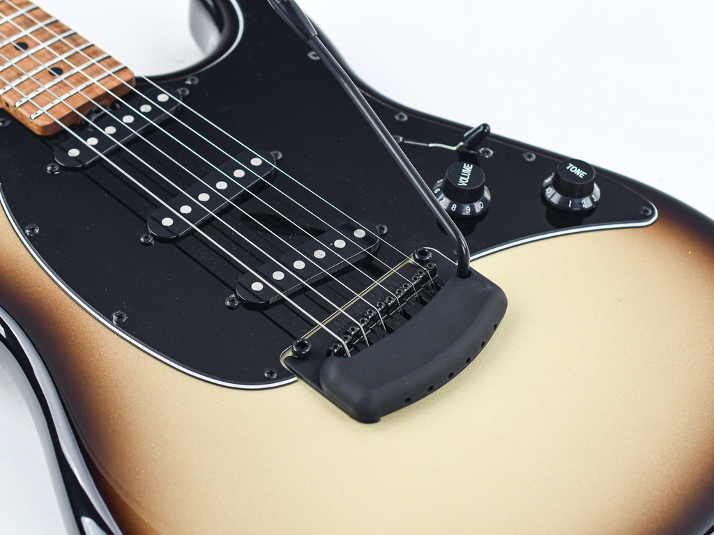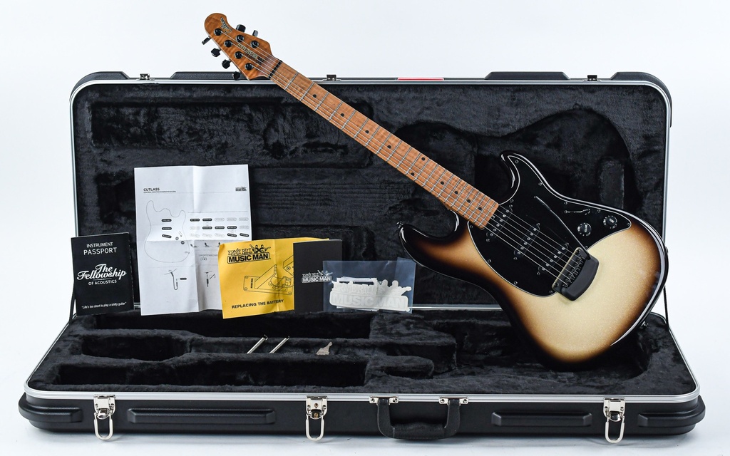 De Music Man Cutlass HT Brulee is voorzien van een spectaculaire sparkle-finish, en is met zijn drie single-coil pickups met gain-boost een uiterst veelzijdige gitaar.