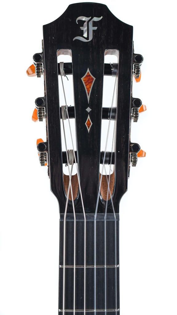 De kop van de gitaar, versierd met vierkante figuren en parel- en faux-tortoise inleg, voegt een vleugje elegantie toe aan het uiterlijk van de gitaar. Furch Classical Nickel machinekoppen met een overbrengingsverhouding van 1:16 zorgen voor nauwkeurige stemming, terwijl de faux-amber knoppen een vintage esthetiek toevoegen.