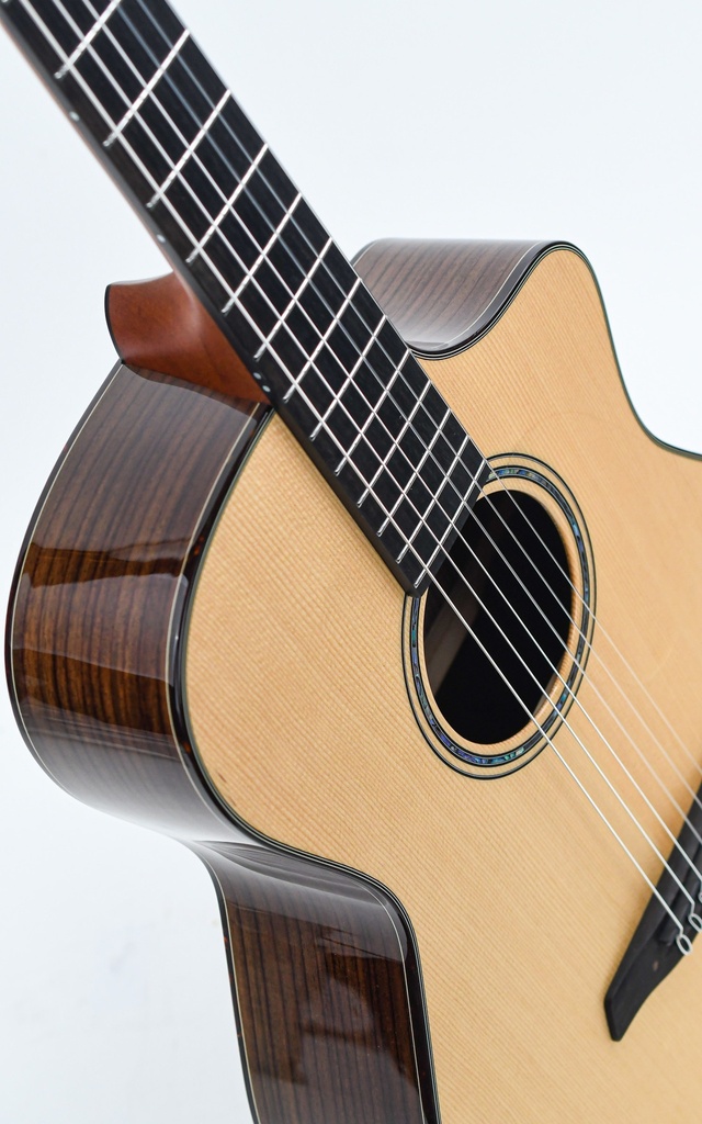 Mit Präzision gefertigt, bietet die GNc-Korpusform ein komfortables Spielerlebnis, wobei der Hals-Korpus-Übergang am 12. Bund einen einfachen Zugang zu den höheren Bünden ermöglicht. Die Gitarre verfügt über eine hochwertige AAA-Grade massive Sitka-Fichtendecke, die reiche Resonanz und ausgewogene klangliche Eigenschaften bietet. Ergänzt wird die Decke durch den massiven AA-Grade indischen Palisander-Boden und -Zargen, die Wärme und Tiefe zum Klang der Gitarre beitragen.