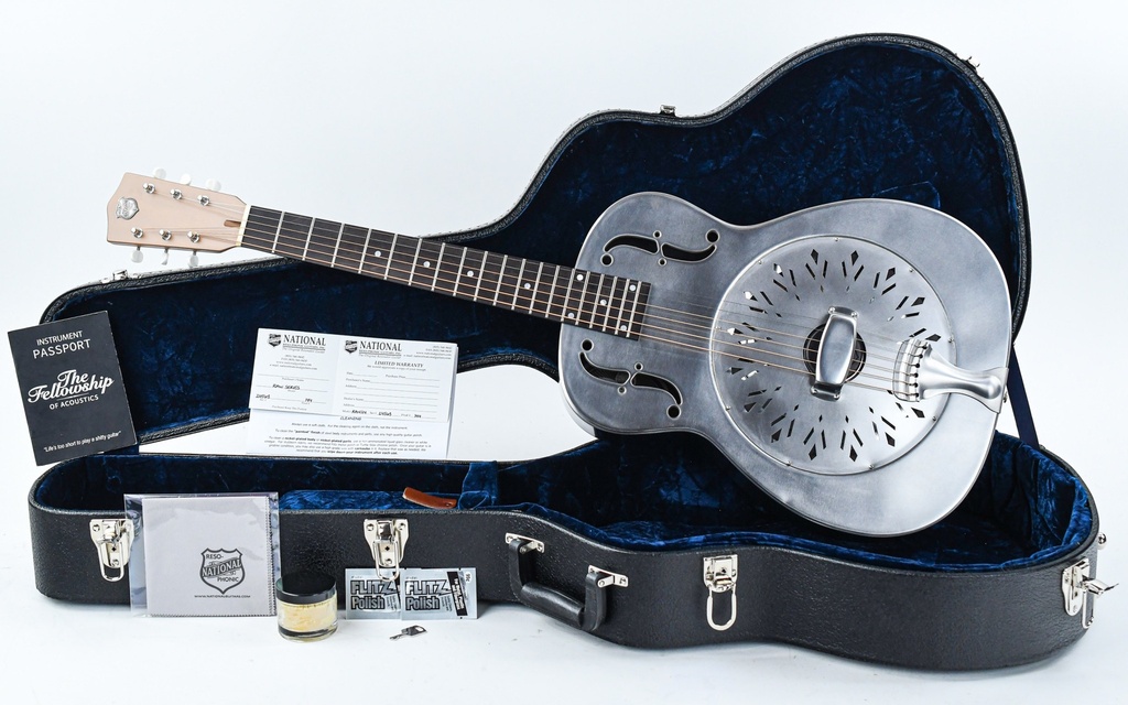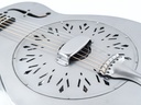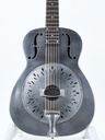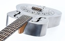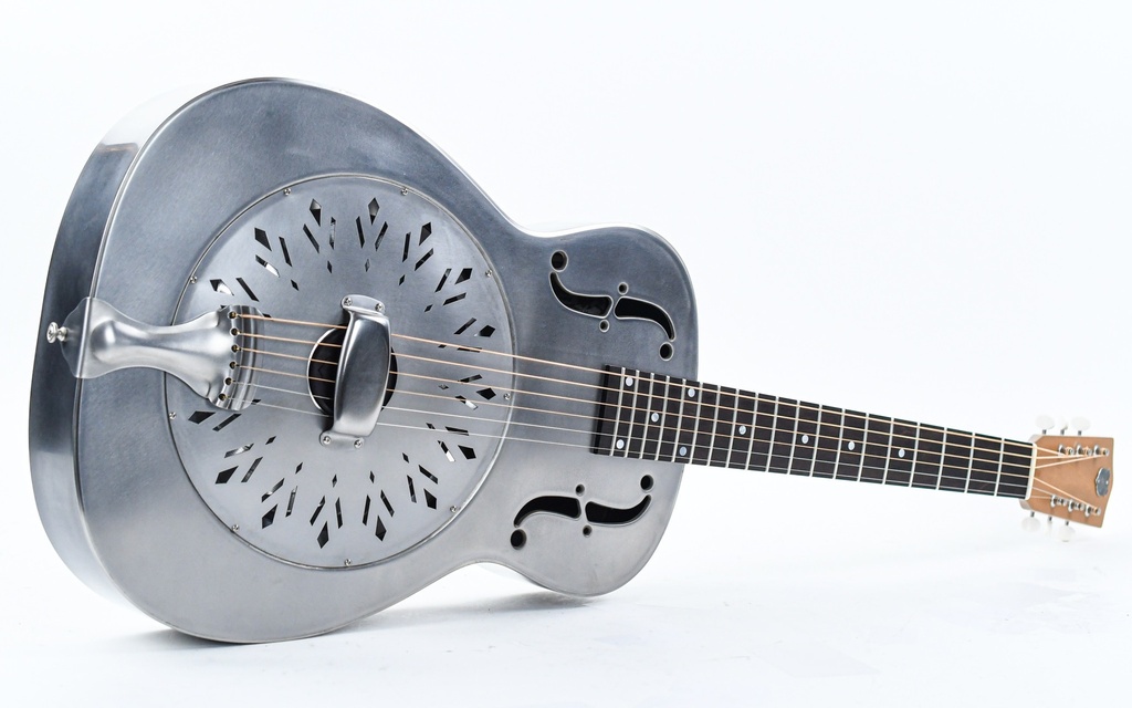 This 14-fret Steel model boasts an all steel, raw finished body, single cone resonator with biscuit bridge, and chicken-feet coverplate. The tinted maple maple neck has the familiar National V shape which has been topped with a thick ebony fingerboard using pearl as dot position markers and 3-on-a-plate tuners.