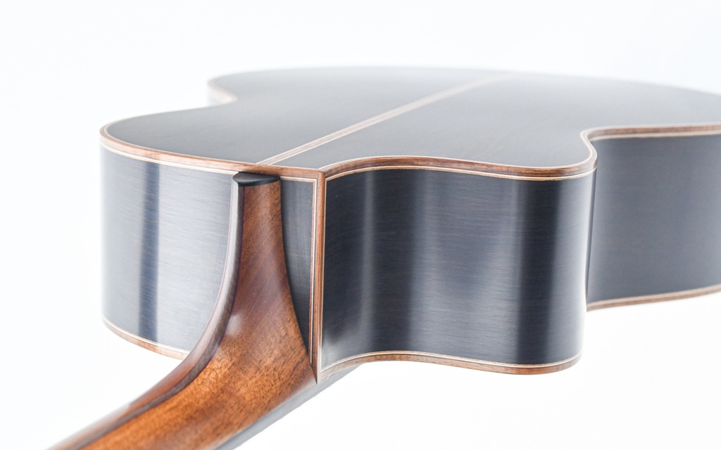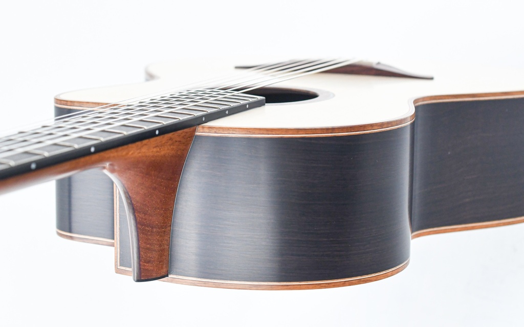 Der typische, klavierähnliche Lowden-Charakter ist bei dieser S50J durch die warme und reiche Klangpalette, die der Boden und die Zargen aus afrikanischem Schwarzholz (Master Grade) bieten, immer noch präsent. Der Korpus ist gepaart mit einer wunderschönen Master Grade Adirondack Fichtendecke und sorgt für beeindruckendes Volumen und Dynamik.