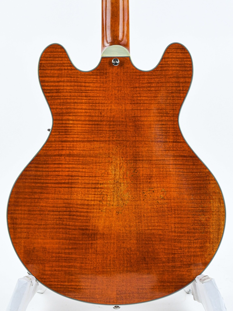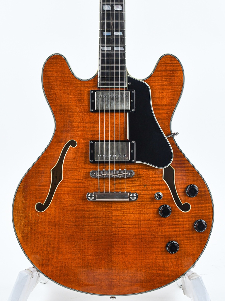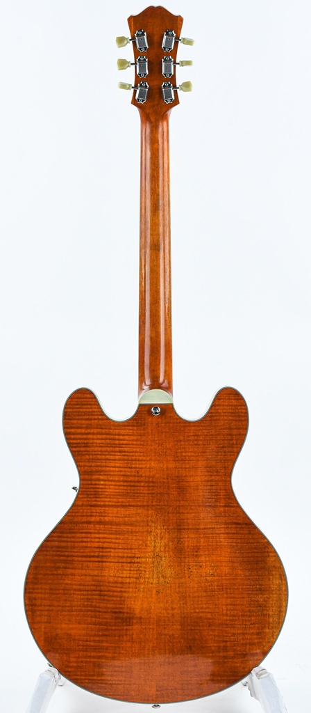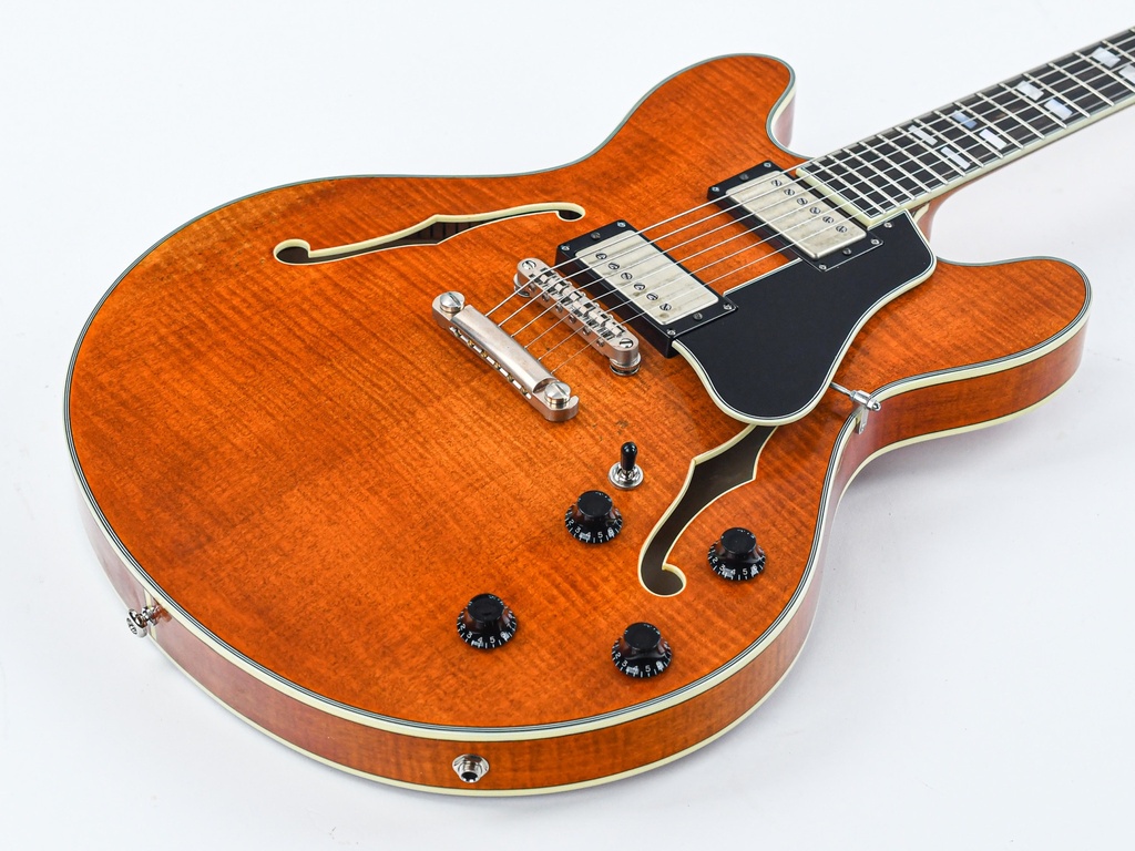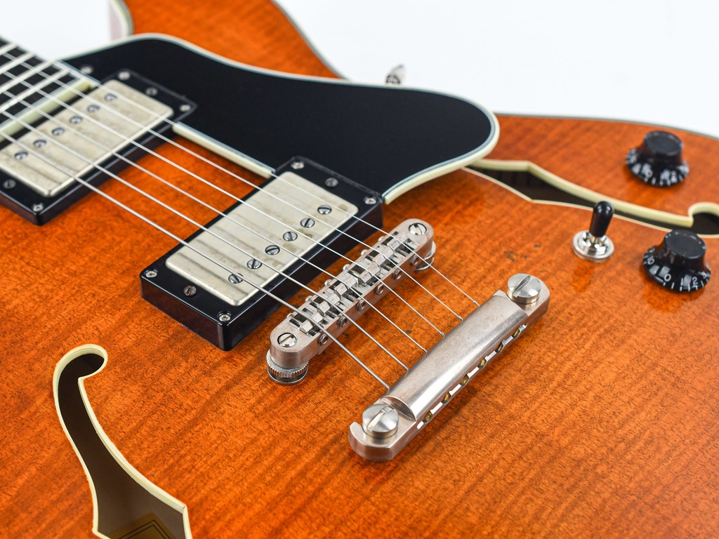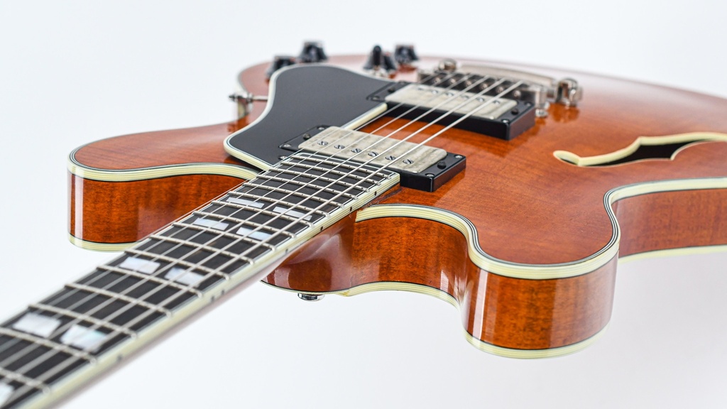 Deze T59/v heeft een constructie van gelamineerd esdoorn, een heerlijke Antique Varnish Amber finish en kwalitatief hoogstaande hardware. Hard spelen op een groot podium met een semi hollowbody? Geen probleem! De gelamineerde constructie minimaliseert feedback met behoud van de klank op een manier die massief hout niet doet.