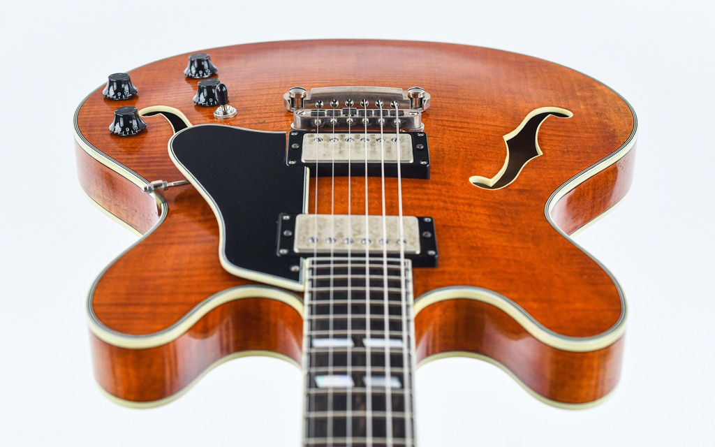 This T59/v boast a a Deluxe maple laminate construction with Antique Varnish Amber finish and matching, high-quality hardware. Playing at louder volumes? The laminated construction minimize feedback while preserving tone in a way that solid wood doesn’t.
